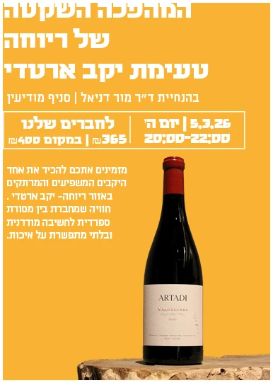 דרך היין מזמינה אתכם להכיר את אחד היקבים המשפיעים והמרתקים באזור ריוחה- יקב ארטדי . במהלך הטעימה נצלול אל הטרואר הייחודי של האזור, דרך יינות המדגישים דיוק, עומק וכבוד לאדמה. חוויה שמחברת בין מסורת ספרדית לחשיבה מודרנית ובלתי מתפשרת על איכות.