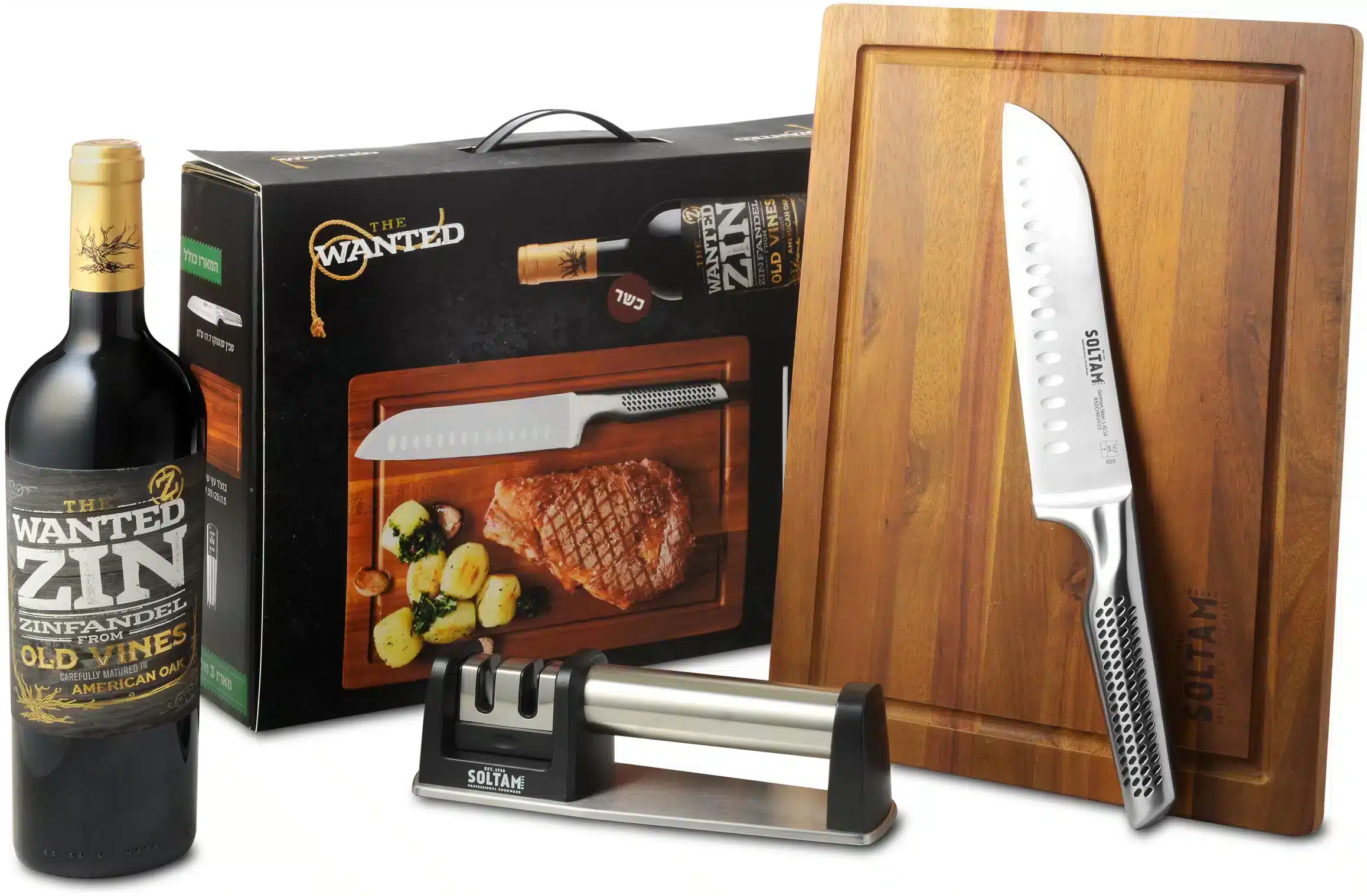 מארז שי מושלם לאוהבי הברביקיו הכולל: בקבוק יין מיקב וונטד מאיטליה (כשר) + חבילת סולתם: קרש חיתוך, סכיף שף, משחיז סכינים.