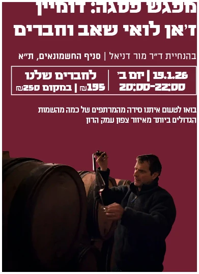 * קיום הסדנה כפוף למצב הבטחוני ויכול להתעדכן בהתאם | זיכוי בסך 30 ש”ח יינתן לרוכשים יינות המשתתפים בסדנה | זיכוי למימוש חד פעמי | זיכוי אחד בעסקה אחת למימוש בסניף בו מתקיים האירוע בלבד בתאריך ובשעות הסדנה בלבד | לחברים שלנו | עד גמר המלאי | ט.ל.ח