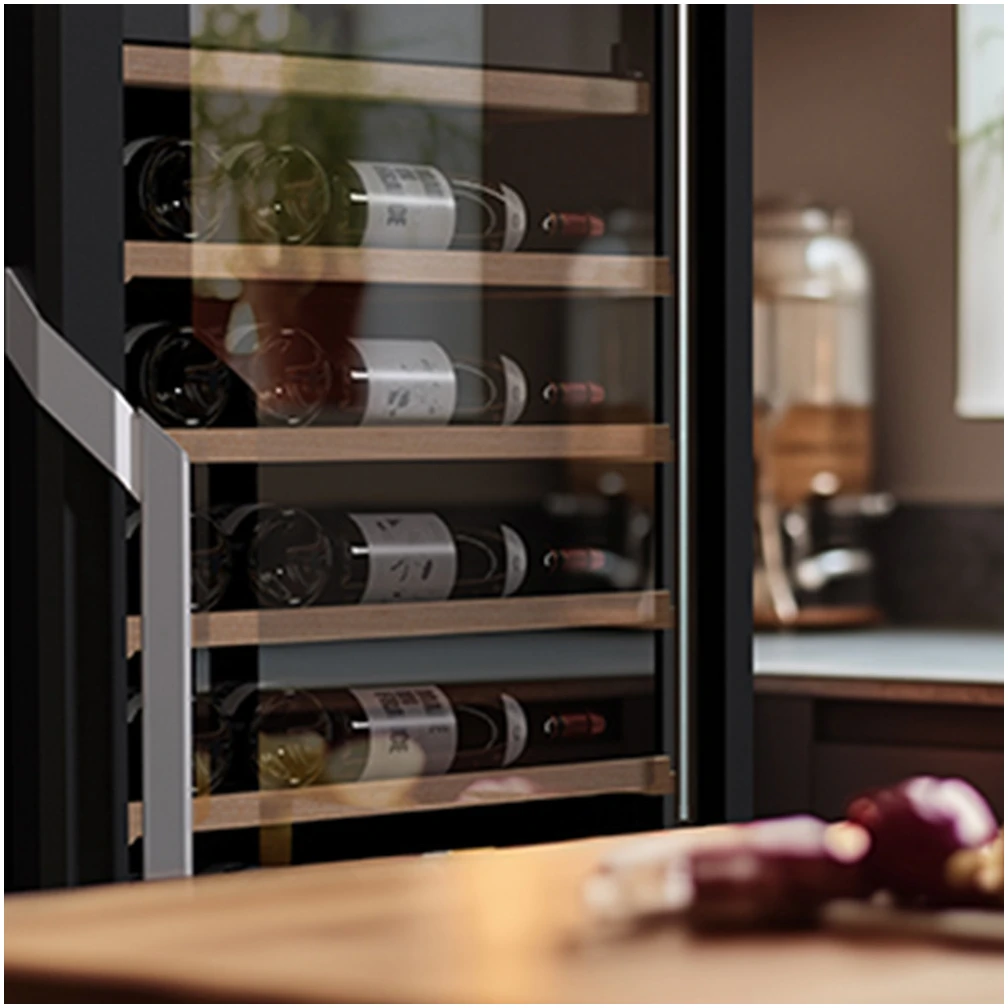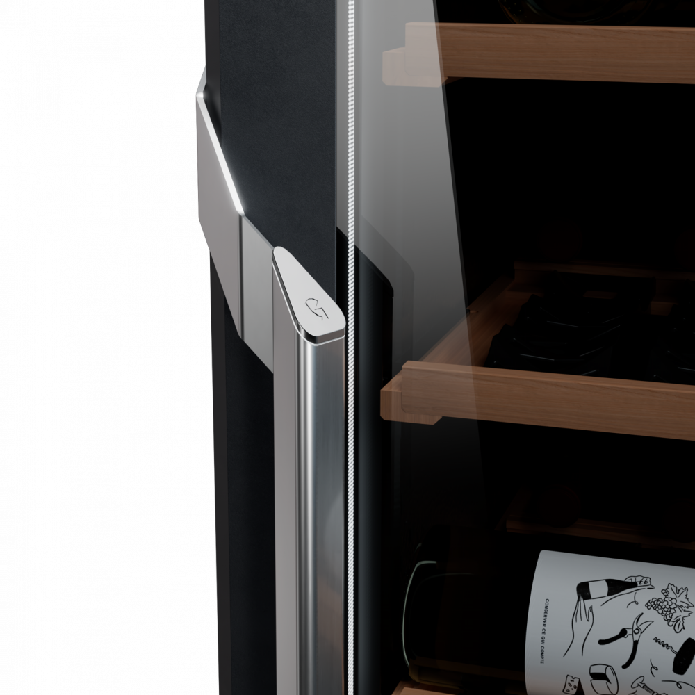 פס תאורת LED לבן לאורך כל המקרר, עם ארבע דרגות בהירות, מדגיש את הבקבוקים ויוצר אווירה אלגנטית. דלת זכוכית כפולה עם ציפוי UV מגנה על היין ושומרת על איכותו לאורך זמן.