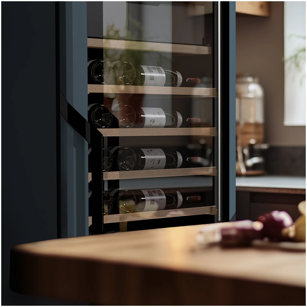 המקרר כולל ארבעה מדפי אחסון הניתנים לכוונון, כך שתוכל לאחסן כל בקבוק – בכל גודל וצורה – בצורה מאורגנת ומודולרית. התכנון מאפשר ניצול מקסימלי של החלל תוך שמירה על סדר ונגישות.