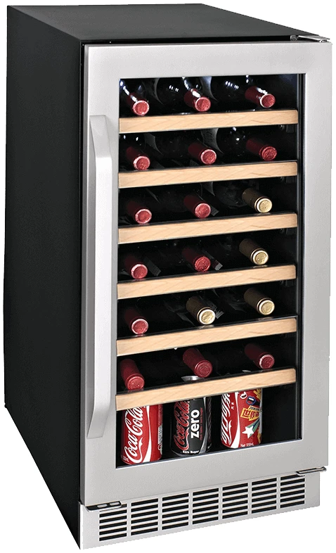 מקרר יינות אלגנטי ומקצועי בנפח של 83 ליטר, המיועד לאחסון של עד 34 בקבוקי יין אדום או לבן.